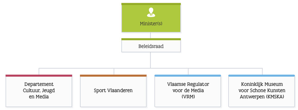 Sport Vlaanderen maakt deel uit van het beleidsdomein Cultuur, Jeugd, Sport en Media (CJSM) en wordt aangestuurd door de Vlaams minister van Sport. Het volledige beleidsdomein vind je terug in onderstaand organogram: